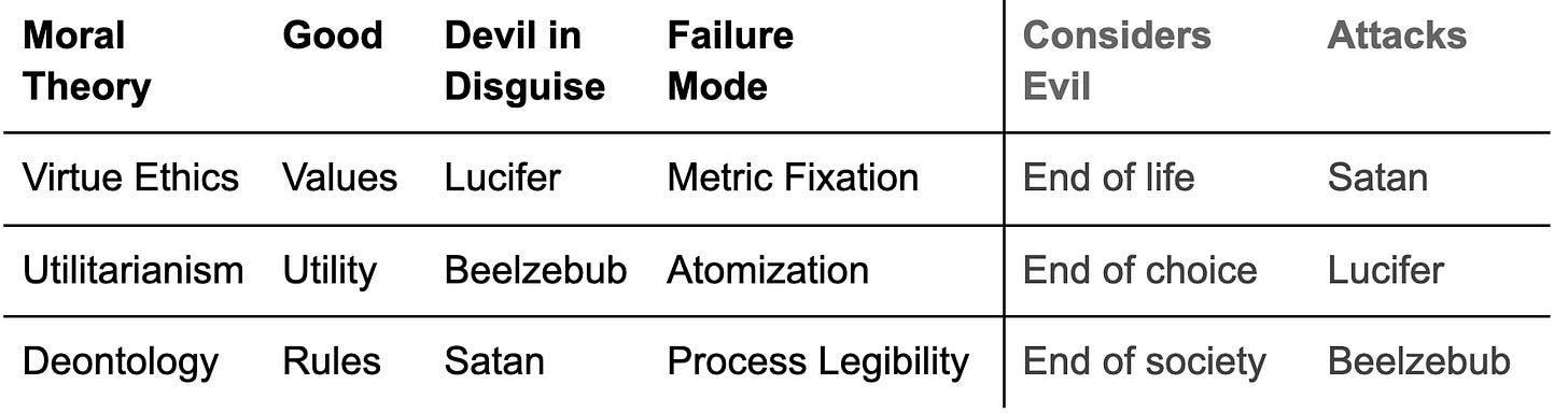Virtue ethics (where Lucifer hides) grounds the good in choice in accordance with values. From its vantage point, Satan is the source of evil that must be defeated because he threatens life itself, the foundation of all values. None of the virtues we care about are worth anything in an empty cosmos. Satan’s cruel processes of death and decay must be vanquished. Not just the unforgiving rules of nature, but bureaucratic systems so rigid that life itself can’t squeeze through the cracks. Entropy wins by procedure and needs to be stopped. We need to liberate ourselves from tyranny.