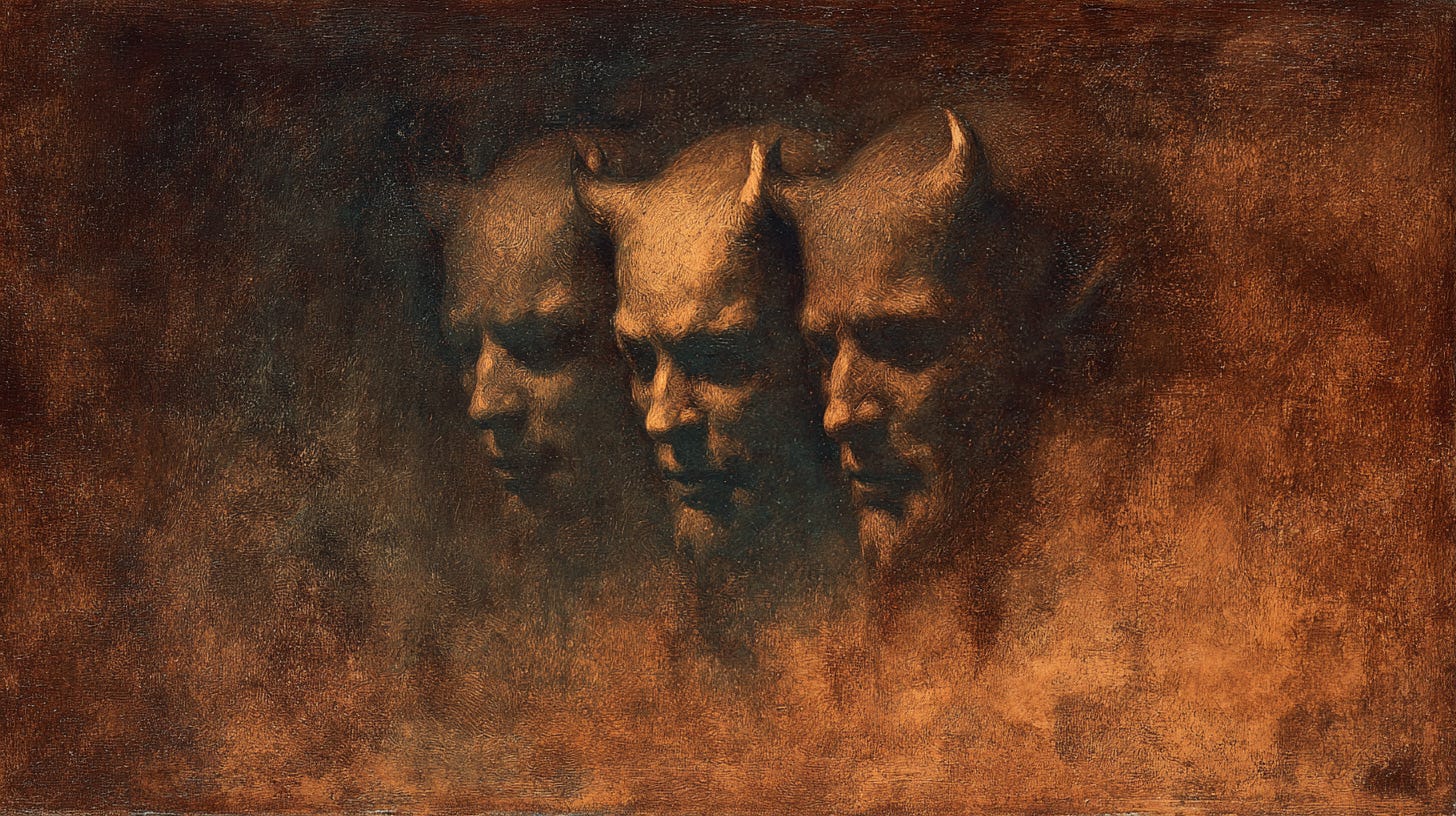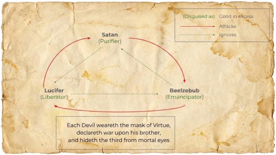 The Devil’s oldest trick is to vehemently oppose one form of evil while wearing a second face and ignoring the third. Exalt one, attack another, ignore what’s in your blind spot. Each faction is convinced they’re fighting the good fight. Each one serving a devil they can’t see because they’re too busy battling a devil they can. This maps, interestingly, to the three Buddhist poisons: craving, aversion, and ignorance. You crave your devil’s promise, rage against your devil’s enemy, and stay blind to the third. The wheel keeps turning.